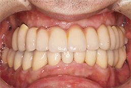 虫歯でボロボロになった歯を上顎は精密な入れ歯、下顎はインプラントやセラミッククラウンを使用して包括治療を行ったケース